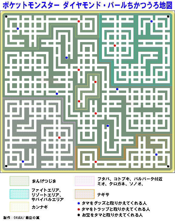 あまり図鑑は進んでいません。 どちらかと言うと、タマゴを孵しながら地下通路で化石掘りに嵌っている感じか。 やってみると意外に面白い。 パールで取れるポケモンの化石は取り敢えず全部取った。 これも。図鑑埋めの過程であるといえばある訳ですが(^^; っと。 「覇空の翼」の副管理人のオルガ君が、地下通路の地図を作ってくれました。 こ、細かい! しかも、グッズやトラップを交換してくれる人の位置や、地上のエリアとの対応まで書いてあって、これは便利ですね。 早速、今まで入れなかったエリアを探索してみたり。 因みに、私の基地は、キッサキから近いあたりです。 地下通路とは関係ないですが、ポケルスについて。 タマゴを孵しまくっているわけですが、その際にポケルスをうつすという作業もしています。 おまけですね。 ただ、ポケルスの治るまでの時間はどういう基準があるのかと思ったら。。。。 ポケルスにかかって治るまでの時間は厳密には分かりませんが、最初に掛かったポケモンが3日だとすると、1日目、2日目、3日目に手持ちのポケモンにうつすと、治るのは同時ということが判明しました。 つまり、最初のポケモンが治る1時間前に、手持ちの他のポケモンにうつすと、うつされたポケモンは1時間で治る...という感じですね。 誰かにあげるポケモンにうつす場合は、なるべく早めに。 かかってすぐの頃に、結構色々なポケモンにうつしてパソコンに預けてあるので、取り敢えずはポケルスの保存は問題ないですが、色々試してみると面白いですね。 ちなみに、ポケルスの効果(もらえる経験値が2倍)は、治った後も持続しますが、他のポケモンにうつすことは出来ません。 状態の項目に「ポケルス」と表示されますが、直るとニコニコマークみたいなものが付きます。 ポケルスに初めてかかって(かかったポケモンを手持ちに入れて)ポケモンセンターで回復すると、ポケモンを返してもらう際に、ポケルスにかかっていると言うこと、育ちが早くなるということを言われます。 マイナスの要素はないどころか育成に役立つので、必須と言っても過言ではないかなと。 もしかかった事がないなら、持っている友達に交換してもらうのも手かと。 PR TrackbacksTRACKBACK URL : CommentsComment Form |