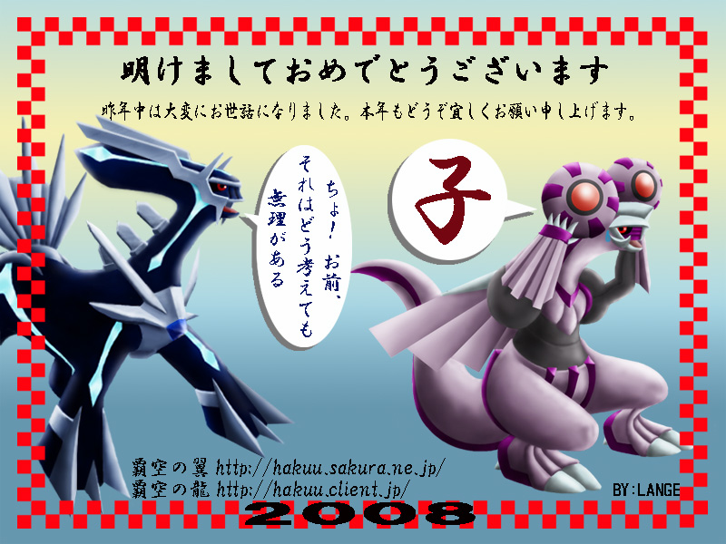 正月早々、手が痛くて波乱の幕開けかな...と。 手は痛くても、兎に角年賀状は描かねばならないだろう。 年末、色々忙しく、更に31日まで仕事だった為、描けずじまいでしたので、正月休みを利用して描こうと。 手が痛いので、なるべく負担にならないようにと色々試行錯誤したものの、やはりいつもより多く時間がかかってしまいました。 時間がかかった割りに、出来た作品といえば....(^^; 干支にちなんで...といっても、王道のネズミポケモンを使うなってそんな普通のことはしない、相変わらず今年もマイペースのLANGEでした。 余談 このパルキア、通常の二倍くらい掛かってます、時間。 ディアルガは、3時間位。 といっても、手描きで下書きをし、スキャナーで取り込んだわけですが、この構図って...と何気に自分の展示作品を見ていたら、「出会うべき者達」のディアルガと構図が殆ど同じという(^^; 試しに重ねてみたら、ほぼ重なるという。 なので、流用しました。 (細部はかなり修正しています) PR TrackbacksTRACKBACK URL : CommentsComment Form |