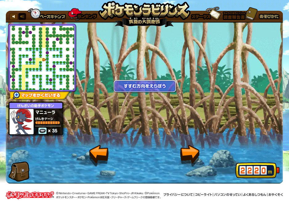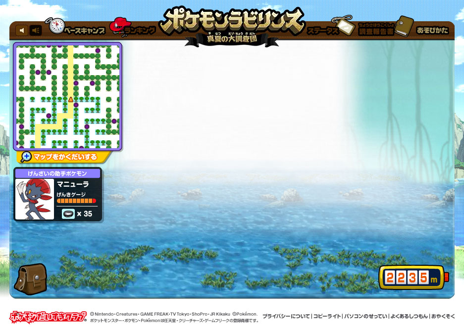 早速、検証してみました。 大迷宮の行き着く先にあるのは何か? 距離を稼げないとまずいので、ここは又もやマニューラさんにご登場頂きまして、兎に角マップの上方向に向けて進んで行く事に。 最初の内は、トレーナーさんが沢山。 しかし、2000m近くになるとポケモンだけに。 なんか寂しいぞ。 本当に永遠にこのままなんじゃないかと思い始めて来た頃、マップの前方に、スタート地点の黄色いラインが! マップを拡大しようとするものの、拡大出来ず。 取り敢えず、こんな感じ。 まだ距離的に進める筈。 では、同じルートをぐるぐると回る事は出来るのか? しかし! スタート地点で、なんと進む方向を選択する矢印が表示されなくなってしまう。 ありゃま! 元気ゲージはまだ残っているのに、これ以上進むも戻るも出来ない状況。 仕方がないので、ベースキャンプに戻る事に。 今回の事で、大迷宮で一定方向に進み続けると、スタート地点へ戻ることが判明。 ずっとまっすぐ進む事は難しいので、回り道を結構してしまったが、約2000m位進むと戻るようです。 ただ、すでに通った黄色のルートを通ろうとすると、これ以上進めなくなり、ベースキャンプに戻るしかなくなってしまうので、注意が必要です。 折角の1回分の大迷宮挑戦が無駄になるので、試してみたい人は注意してね。 それにしても。 これって、不具合の1つだよね? 無駄に真っ直ぐ進む人が発生する事をまさか考慮してなかったなんて事は、、、。 PR TrackbacksTRACKBACK URL : CommentsComment Form |