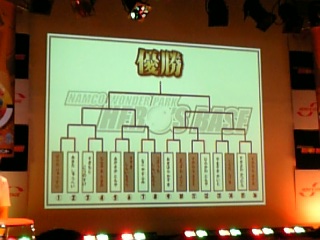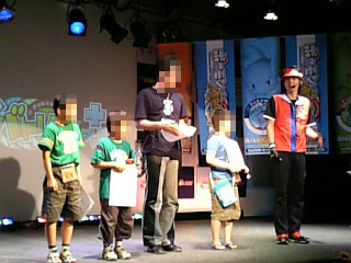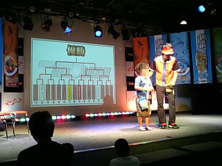 仲間と待ち合わせ、開店少し前に入り口へ。 ...。意外に人少ない感じ。 先着ではなく、12時までに受付を済ませればOKというシステムなので、まあ、妥当か。 自分は、開店と当時に、スタッフの誘導の元、大会参加受付場所へ。 受付場所。 手前右にバトリオの筐体が置いてあるので、寧ろそっちが混んでます。 バトリオリーダーのショウさんが、ノリノリでプロモーションしていました。 受付では、シート(切り離せるような形になっている)に、名前と年齢を書き、チラシをもらい、早速会場へ。 会場は結構本格的。 ステージ下手にバトリオの筐体と、椅子が二つ。中央に大きなスクリーンがあります。 抽選まで、かなり時間があるので、バトリオをプレイに。 しかし、並び列が結構しんどいので、2回ほどプレイして、そのままナムコワンダーパークのゲームセンターで時間つぶし。 (ディアパルのソフビフィギュアを取るのに躍起になったり...) さて。 12時半。 ステージにバトリオリーダーのショウさんが登場し、漸く抽選開始。 みると会場は席は満席、その周りも黒山の人だかり。 ショウさんは250名位と言っていたが、もっといそうだ。 その中で参加できるのは16名。かなりの狭き門である。 抽選中。 皆が固唾を呑んで見守る中、次々と当選者の名前が呼ばれる。 自分も仲間2人も、残念ながら落選となりました。 当選者は首から参加証を下げてもらい、一旦解散。 ちなみに、当選者は 大人1:2子供 くらいの感じでしょうか? 小学生位の小さい子か、大人のどちらか...という感じ。 1時、大会スタート。 中央のスクリーンにトーナメント表が映し出され、呼ばれた順番に、1組ずつ、ステージ上の筐体でバトルをしていく...という進め方。 1回戦終了時のトーナメント表。 後程、イベントレポートの方に詳細を出しますが、全体的に使われているパックは、ハイパーはカメックス、ゴウカザルが、スーパーは、ヨノワール、ブーバーン、カイリキーが、ノーマルは、ニューラ、ドーミラーが目立ちました。 珍しい組み合わせみたいなバトリオは、1回戦で悉く落ちてしまったようで、2回戦以降は結構傾向が似ている組み合わせが多かったです。 どの選手も、2回戦目以降は、対戦ごとに組み合わせを替えなかったのが特徴ですね。 2回戦を勝ち上がったのが、全員、ハイパーにカメックスを投入している選手ばかり。 そのため、準決勝の段階で、4人の選手の使うハイパーが皆、カメックスになるという事態に。 決勝はカメックス・ドサイドン・ニューラvsカメックス・ブーバーン・パチリスという組み合わせ。 優勝は後者。 優勝選手へのインタビュー。 参加選手全員に、賞品の大会ハヤシガメが贈呈。 4位までに入った選手には、表彰状が贈られた。 表彰式の後は、抽選会。 パルシティのヒコザル15枚とショウさんのサイン入りパック事典2冊。 結構帰ってしまった人が多く、かなり引きなおしがされていました。 1/3位は帰ってしまった感じでした。 終了間際の客席。 でも、まだ多いね、人。 そんなこんなで、大会も無事に終了。 大会自体には参加できなかったのですが、いい勉強になったというのが正直な気持ちです。 子供はもちろんですが、今日のように大人でも参加できる大会を、もっと増やして欲しいですね、今後。 余談。 今日来なかった友達が、地元のスーパーで入手してきた情報。 第5弾から、新しいシステムが導入されるかもしれないらしい。 (ロケテス段階なので、まだ決定ではないようだ) 今後のバトリオの動きにも、注目したいものだ。 |