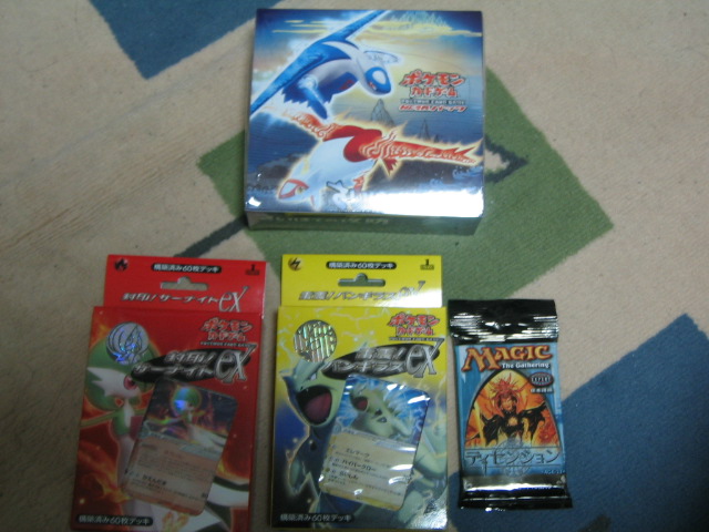わーっ(拍手) 但し、給料日1日前につき1Pずつにorz 1つ関係ないのが入っているって? まあ、気にしない(^^; で、何はともあれ、開けてみる。 コモンは4枚ずつコンプ。 アンコモンも大体コンプ。 レアは微妙ながら、結構いい感じにばらけてくれたので、結構揃った感じ。 exは5枚。 ☆はなし。 後で、箱開けレポ出します。 さて、スターターのリスト作らないと...。 おまけ こちらも開けて見ました。 追記 ようやく、スターターリスト完成。 発売日当日中に出来てよかったです。 箱開けレポート 今回ex多いらしいです。 というか、総枚数に対して、exが多いというのが理由ではないでしょうか? 拡張パックがトレーナーがちょっとイマイチなのに対して、スターターが充実していますね。 主だったるサポーターが目白押し! 超のラルキルが再録。 闘のヨーギラス~サナギラスが、e1からの再録という、意外な収録もありました。 PR 2006.06.28 Wed 23:14:09 ポケカサイト管理人への50の質問折角あるのに、忘れられてそうだからやってみますね。
